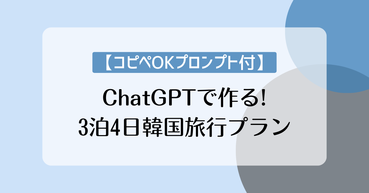 そんなとき、ChatGPTを使えば3分で完璧な旅行プランが完成します。本記事では、実際にChatGPTで作成した韓国3泊4日プランを公開し、誰でもすぐに使えるプロンプトをご紹介します。