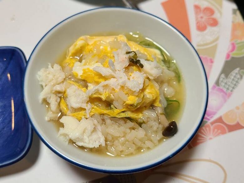 ズワイガニの旨味が溶け込んだ出汁は絶品!野菜と一緒に煮込んで、〆は雑炊で楽しめます。